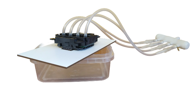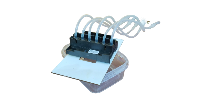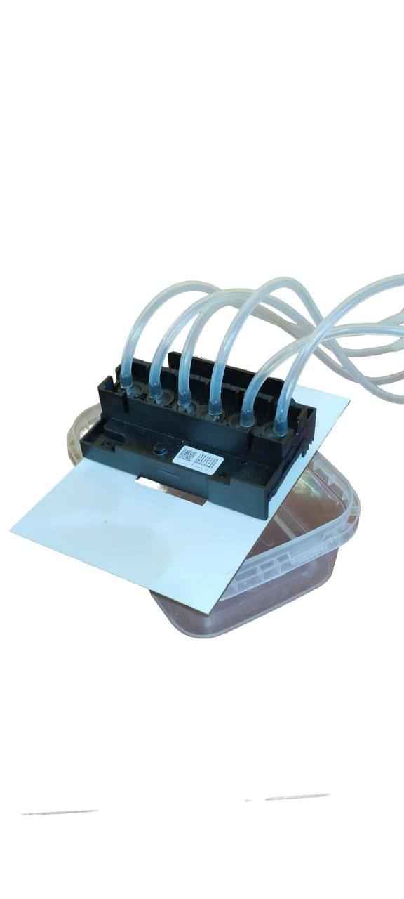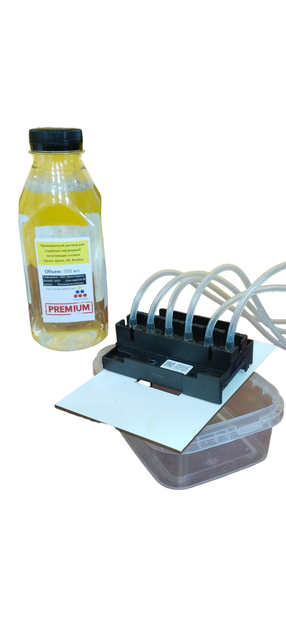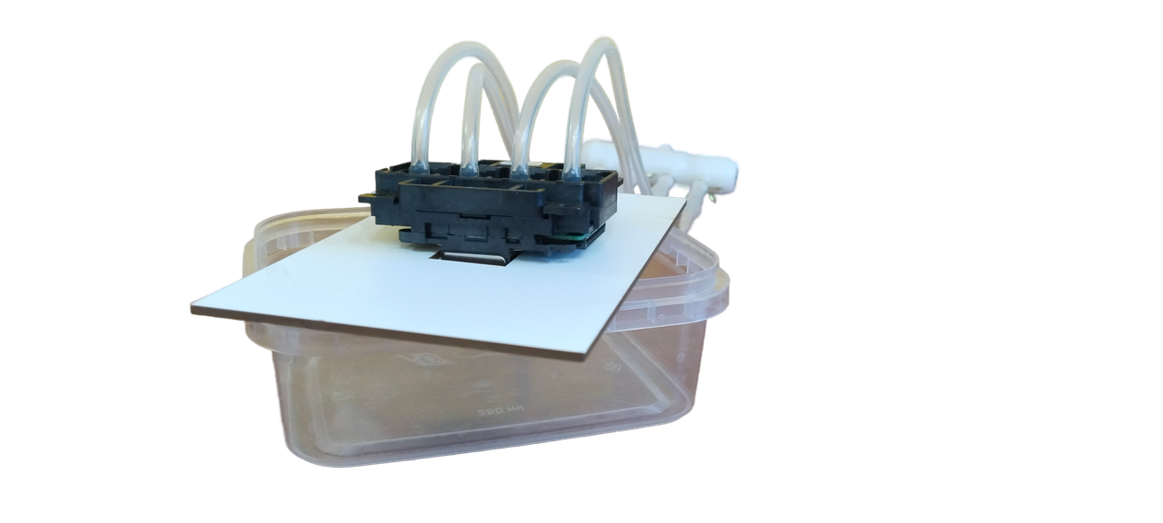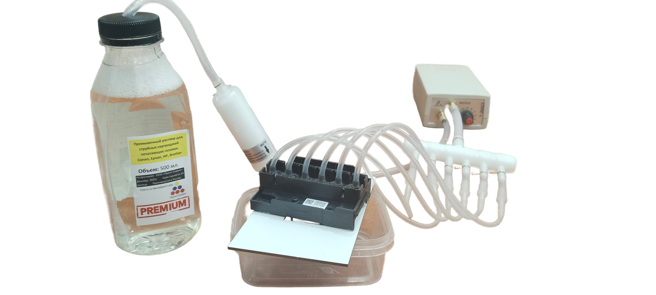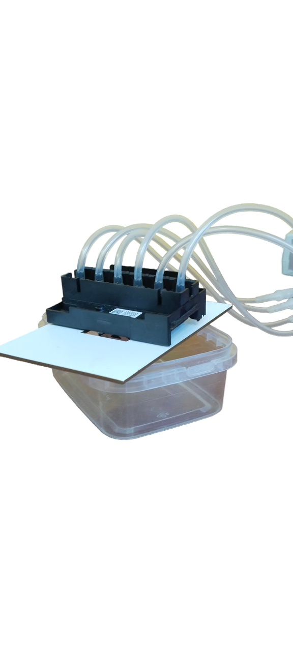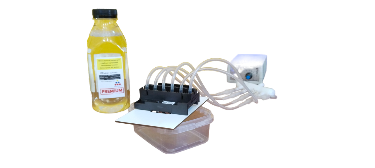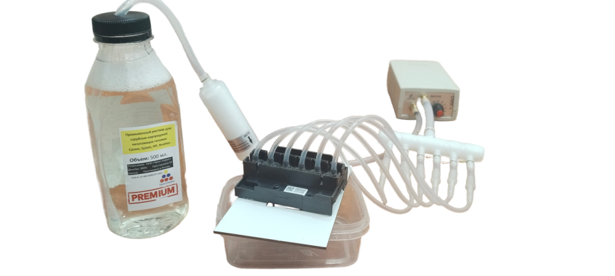 Промывочный раствор подается через трубку в станцию, предварительно пройдя через фильтр тонкой очистки, (интенсивность подачи раствора регулируется), далее жидкость поступает через разветвитель на печатающую головку. Головка ставится в держатель под которым расположен контейнер для сбора отработанной жидкости (в комплект не входит).